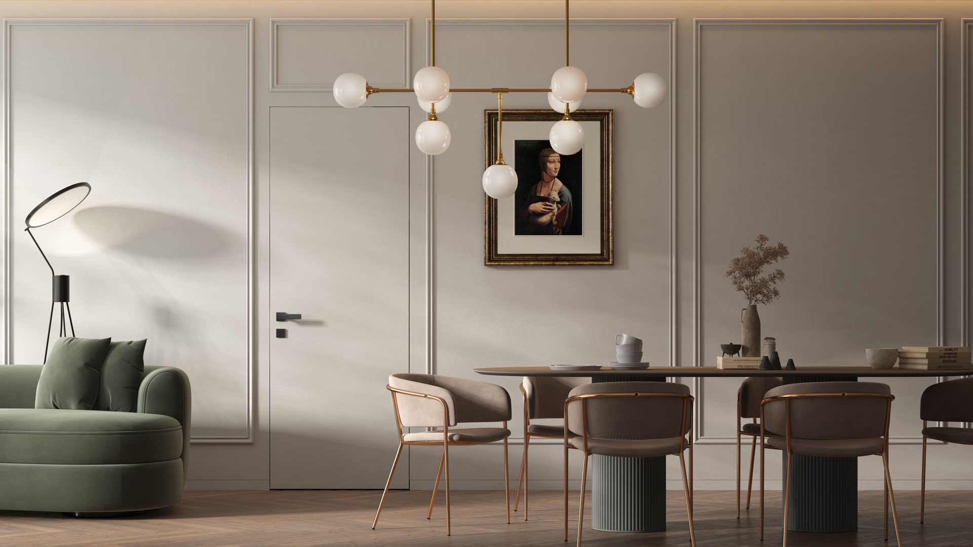 Скрытые двери высотой до трех метров — самое частое решение в современном интерьере. Такие полотна встраиваются в один уровень со стеной, без видимого короба и наличников. Их поверхность можно декорировать любым материалом от краски до обоев.