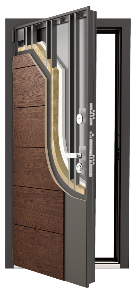 Закрытая усиленная коробка входной двери представляет собой полую металлическую сварную раму из профилей сложной конфигурации для увеличения устойчивости к деформации при взломе силовым методом. Она надёжно фиксируется в проеме шестью крепёжными пластинами из стали толщиной 3 мм.